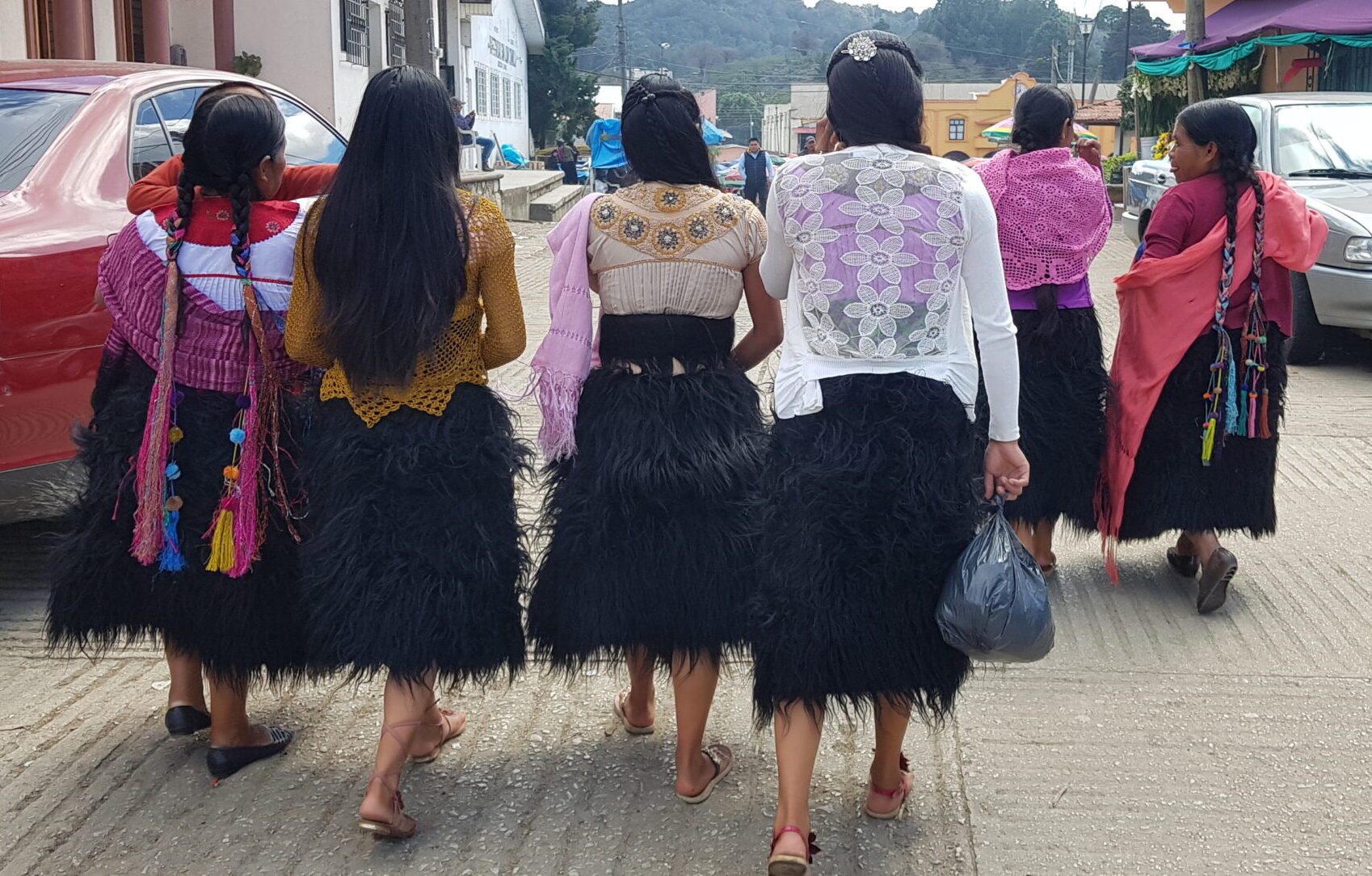 Les femmes portent une jupe longue en laine noire, appelée nahua, maintenue par une ceinture brodée de couleurs vives, ce qui est l’un des rares éléments colorés dans leur tenue traditionnelle. Elles portent également un huipil, ce haut de forme carrée, souvent décoré de broderies simples. Enfin, leurs longues tresses sont ornées de rubans colorés et parfois de pompons, apportant une touche joyeuse à l’ensemble. es hommes, quant à eux, portent généralement une chemise et un pantacourt blancs et légers, par-dessus lesquels ils enfilent un poncho de laine noire ou blanche, appelé chuj, attaché à l’aide d’une ceinture de couleur orange ou rouge. Ils complètent leur tenue avec un chapeau en paille et des huaraches, des sandales en cuir typiques de l’époque précoloniale.