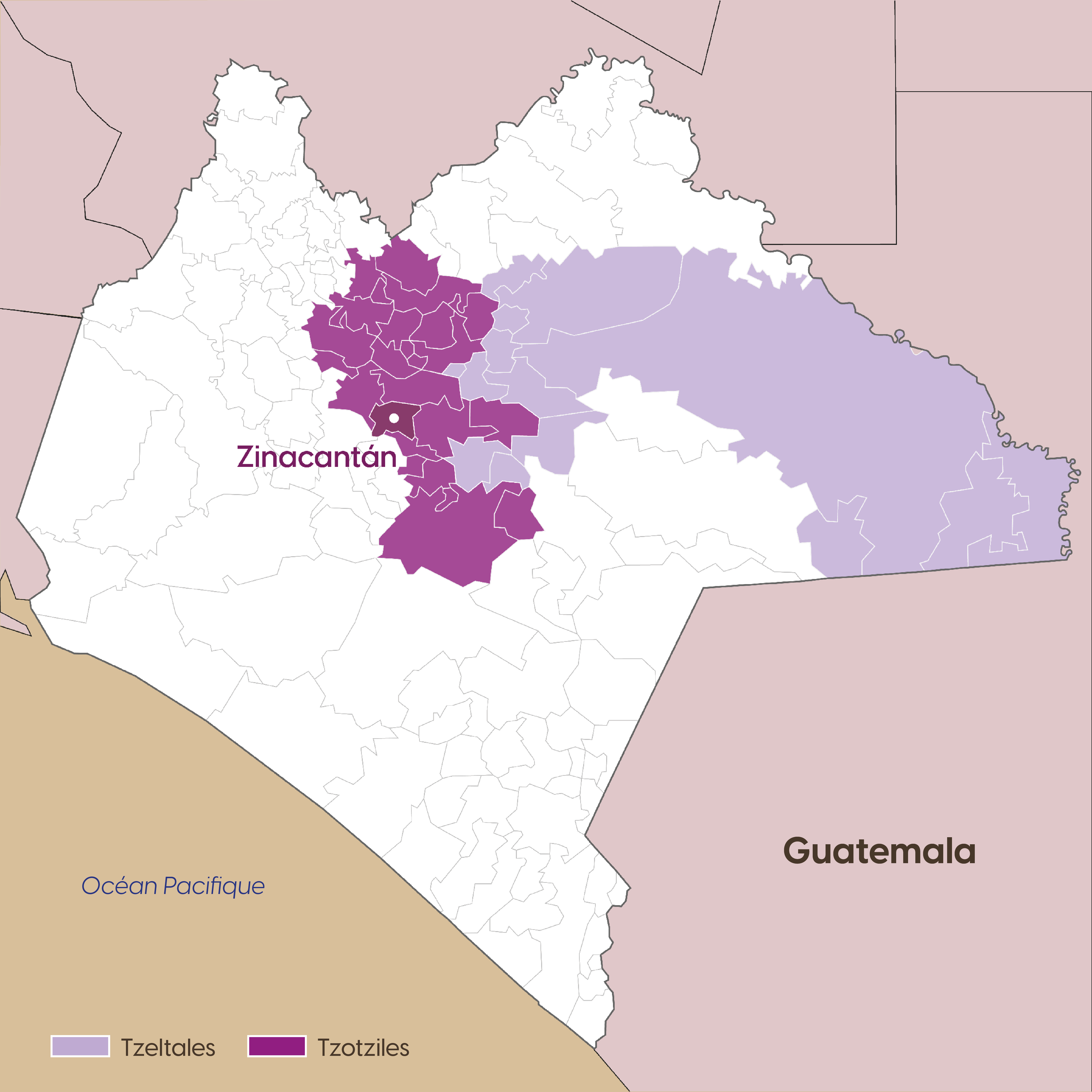 Plus précisément, Zinacantán se situe dans la région de “Los Altos de Chiapas“ (en vert sur la carte), qui se trouve dans la partie centrale de l’État, et occupe approximativement 15% de son territoire.