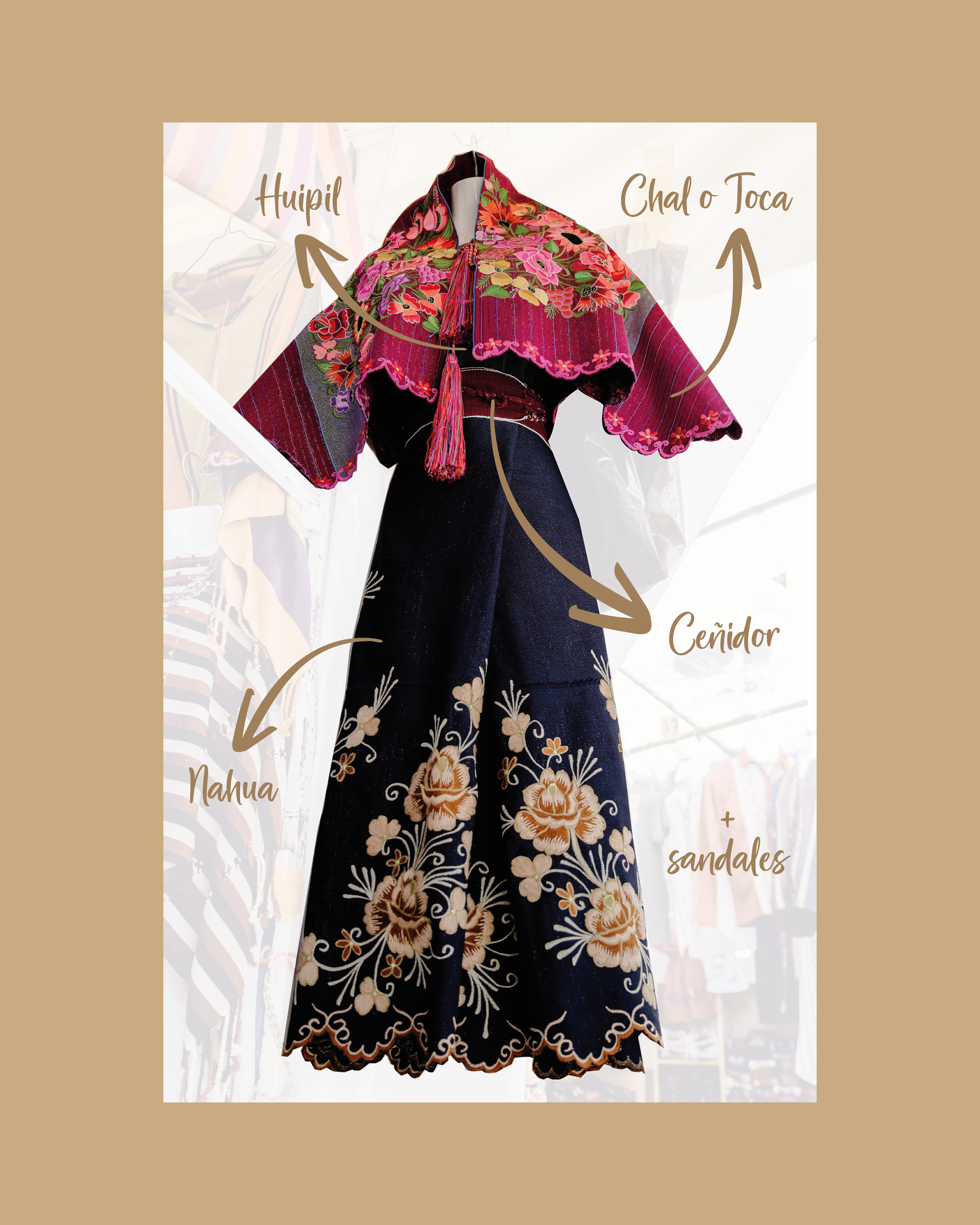 Le vêtement traditionnel des femmes comprend un huipil (blouse ou t-shirt), un chal ou toca (cape courte), un ceñidor (ceinture large) et une nahua (jupe enroulée). Celui des hommes comprend surtout un poncho, appelé chuj en langue locale, qu’ils portent au-dessus d’une chemise blanche à manches longues, un pantalon sombre (parfois aussi brodé) et un chapeau de paille orné de rubans colorés, surtout utilisé lors des grandes fêtes.